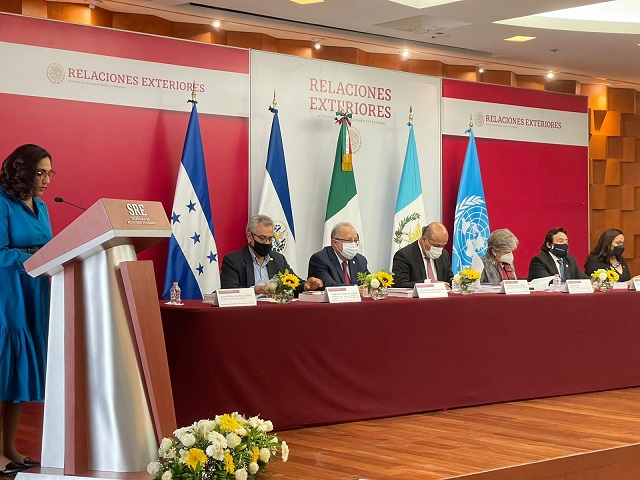 México, 17 de septiembre de 2021. El ministro y viceministro de Relaciones Exteriores de Guatemala, embajadores Pedro Brolo Vila y Carlos Ramiro Martínez, participaron junto a altas autoridades de El Salvador, Honduras y México en la entrega oficial del Plan de Desarrollo Integral (PDI) por parte de Alicia Bárcena, secretaria ejecutiva de la Comisión Económica para América Latina y el Caribe (CEPAL), dirigido a atender las causas estructurales de la migración por medio de cuatro pilares y 15 programas temáticos.