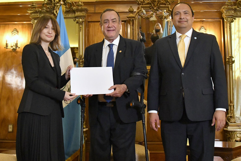 Durante un acto especial en Casa Presidencial, el mandatario Alejandro Giammattei recibió las cartas credenciales de la embajadora de Ucrania designada para Guatemala, Oksna Dramaretska.
