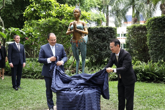 Para concluir la visita se desarrolló un solemne acto en la sede de la Cancillería, donde se develó una estatua de la diosa Kinnaree que donó el Gobierno de Tailandia, representativa de su cultura, en el marco de la conmemoración de los 65 años de relaciones diplomáticas.