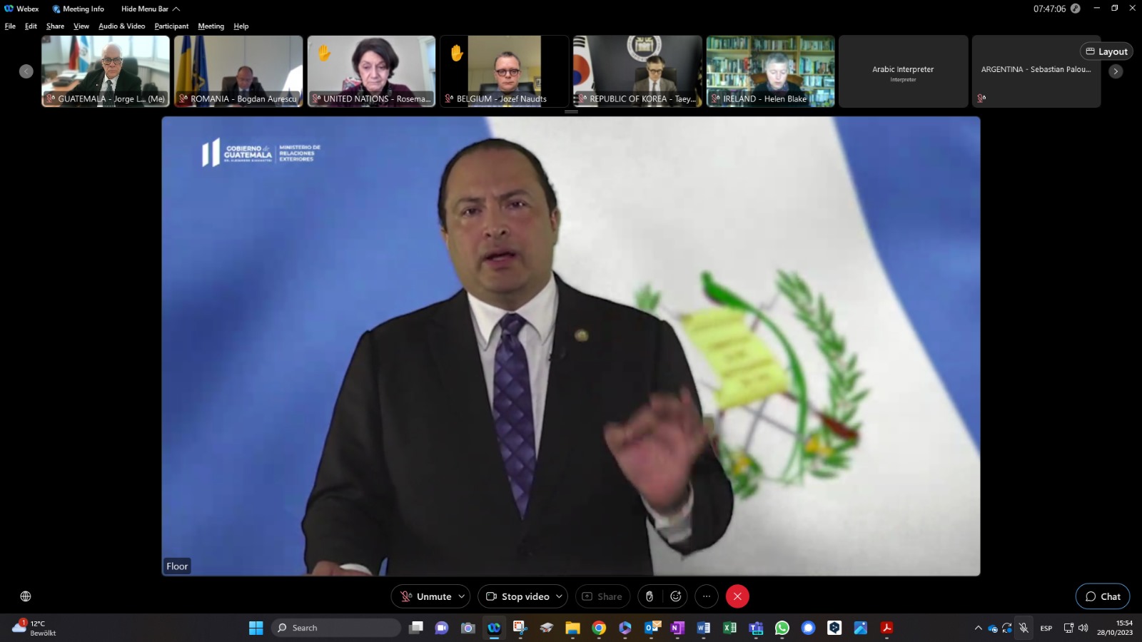 Guatemala, 28 de octubre de 2023. El ministro de Relaciones Exteriores, Mario Búcaro, en representación del presidente de la República, Dr. Alejandro Giammattei, intervino hoy en la Reunión de Asesores de Seguridad Nacional sobre la Fórmula de la Paz en Ucrania, en la cual refrendó la firme posición de Guatemala en defensa de la soberanía e integridad territorial ucraniana.