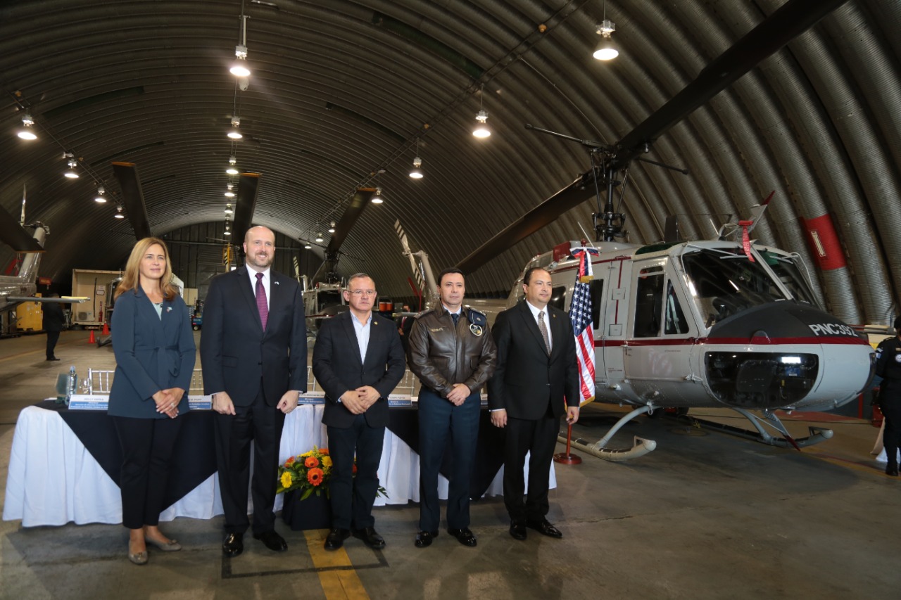El titular de la cartera del Interior, David Napoleón Barrientos recibió del embajador de Estados Unidos de América, Wiliam W. Popp, la documentación que transfiere las responsabilidades técnicas y operativas de la flotilla de 5 helicópteros UH-1H ll, de la Fuerza de Tarea de Interdicción Aérea, Antinarcótica y Antiterrorista (FIAAT) de la Policía Nacional Civil (PNC).