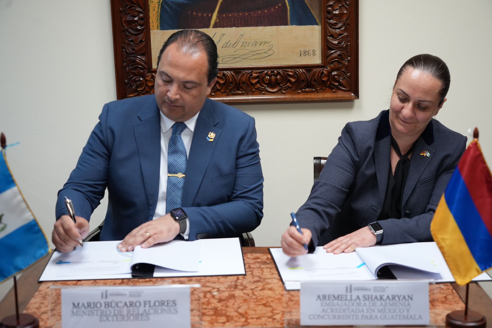 Ciudad de Guatemala, 12 de abril de 2023. El ministro de Relaciones Exteriores de Guatemala, Mario Búcaro, y la embajadora de Armenia acreditada en México y concurrente para Guatemala, Armella Shakaryan, suscribieron hoy el Memorándum de Entendimiento para el establecimiento de Consultas Políticas.