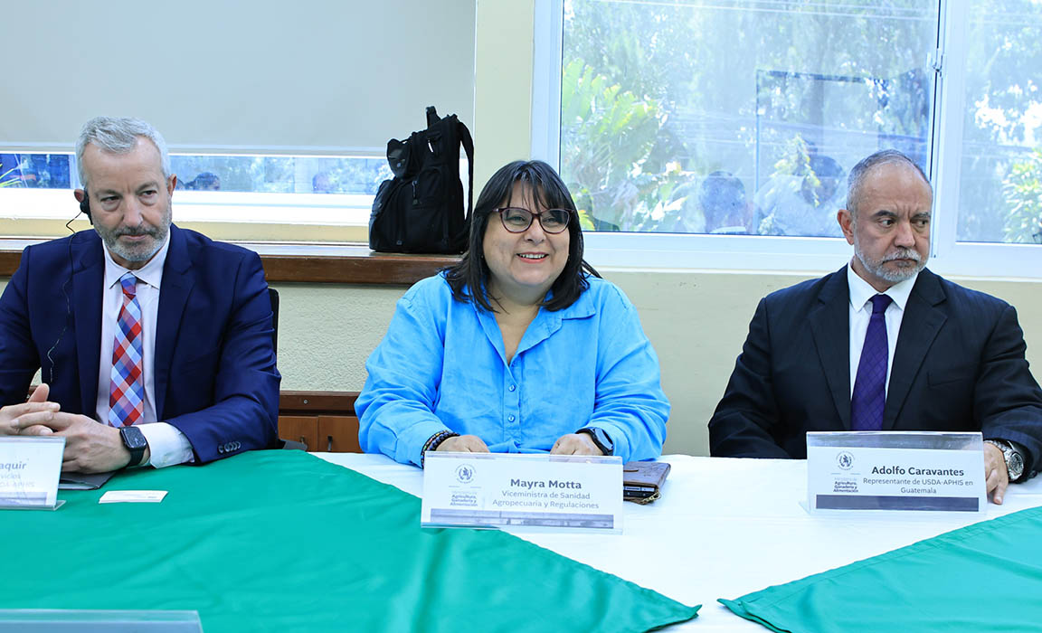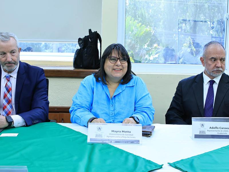 La viceministra de Sanidad Agropecuaria y Regulaciones, Mayra Motta, sostuvo una reunión de trabajo con representantes del Departamento de Agricultura de los Estados Unidos (USDA) y del Servicio de Inspección de Sanidad Animal y Vegetal (APHIS), durante la cual presentó las medidas implementadas por el Ministerio de Agricultura, Ganadería y Alimentación (MAGA) en la prevención y control del Gusano Barrenador en el país. USDA-APHIS apoyarán eventualmente las acciones que se desarrollan para el combate de la plaga.