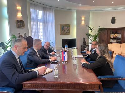 Belgrado, Serbia, 11 de marzo de 2026. El Vicecanciller Julio Orozco se reunió con el Embajador Dušan Kozarev, Secretario General en funciones del Ministerio de Asuntos Exteriores de Serbia, durante la Segunda Reunión Internacional de Participantes (IPM) de la Expo 2027 Belgrado.