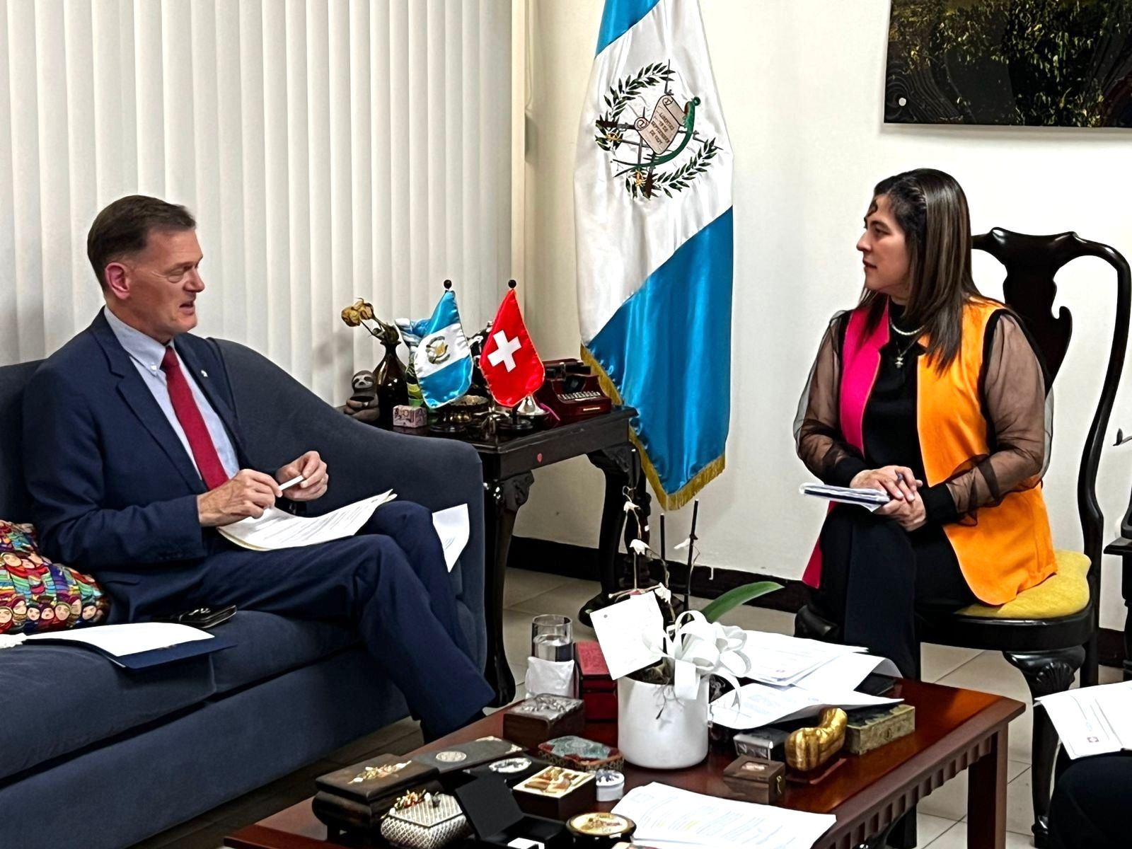 Durante el encuentro, se destacó la solidez de la relación entre Guatemala y Suiza, fundamentada en principios y valores compartidos como el respeto a la democracia, al Estado de derecho y principios del derecho internacional, entre otros asuntos. Asimismo, se conversó sobre la implementación de convenios vigentes y las oportunidades para ampliar iniciativas conjuntas en áreas de interés común.