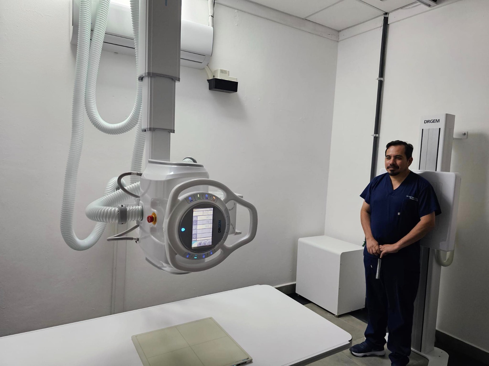 Este rayos X digital es cielítico, se maneja en la parte superior de la sala, por lo que se moviliza con facilidad y minimiza el tiempo de espera. Cuenta con un UPS para respaldar y cuidar la vida del equipo, además, tiene 7 visualizadores para obtener los resultados de imágenes que servirán para diagnosticar más rápido a los pacientes.