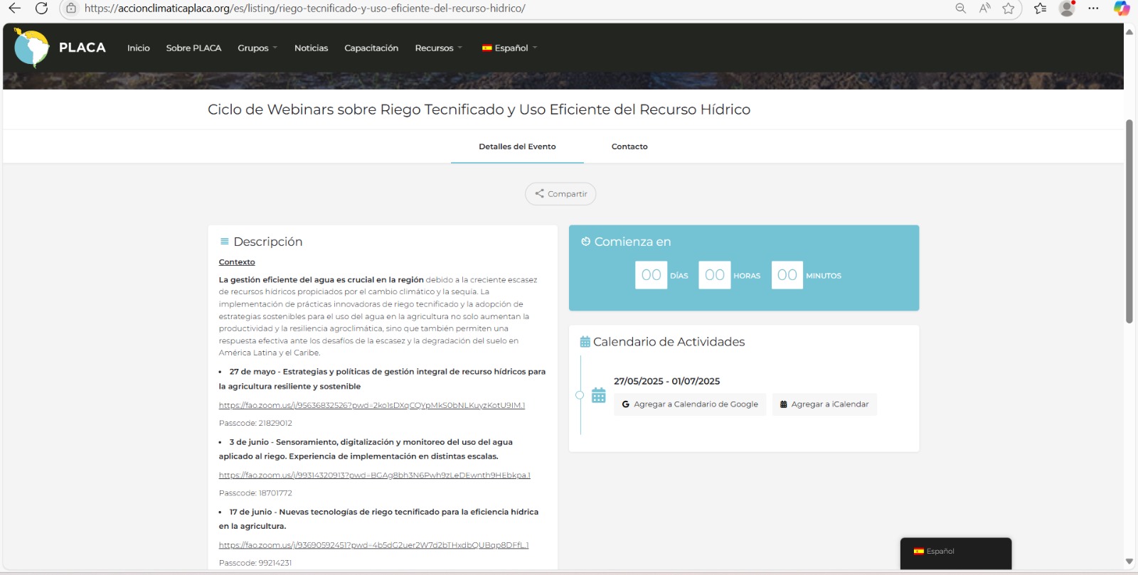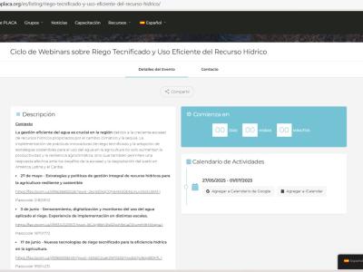 Con el objetivo de fortalecer y consolidar los conocimientos acerca del uso sostenible del recurso hídrico en la agricultura, la Plataforma de Acción Climática en Agricultura de Latinoamérica y el Caribe (PLACA,) desarrolla el “ciclo de Webinars en riego tecnificado y uso eficiente del recurso hídrico”.
