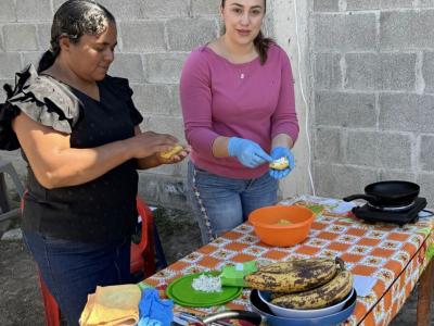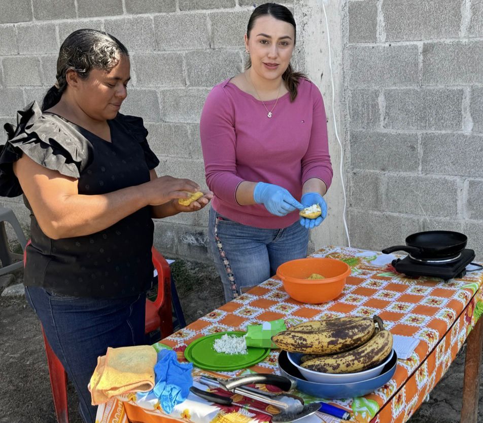 Durante la jornada, las participantes elaboraron bombas de plátano rellenas de frijol y manjar a base de leche, integrando productos locales con alto valor nutricional.