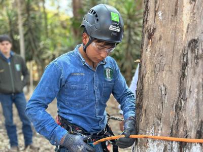 Durante la jornada de campo, los alumnos aplicaron conocimientos relativos a la identificación de fuentes semilleras de alta calidad y desarrollaron prácticas de ascenso a árboles para la cosecha de material vegetativo.