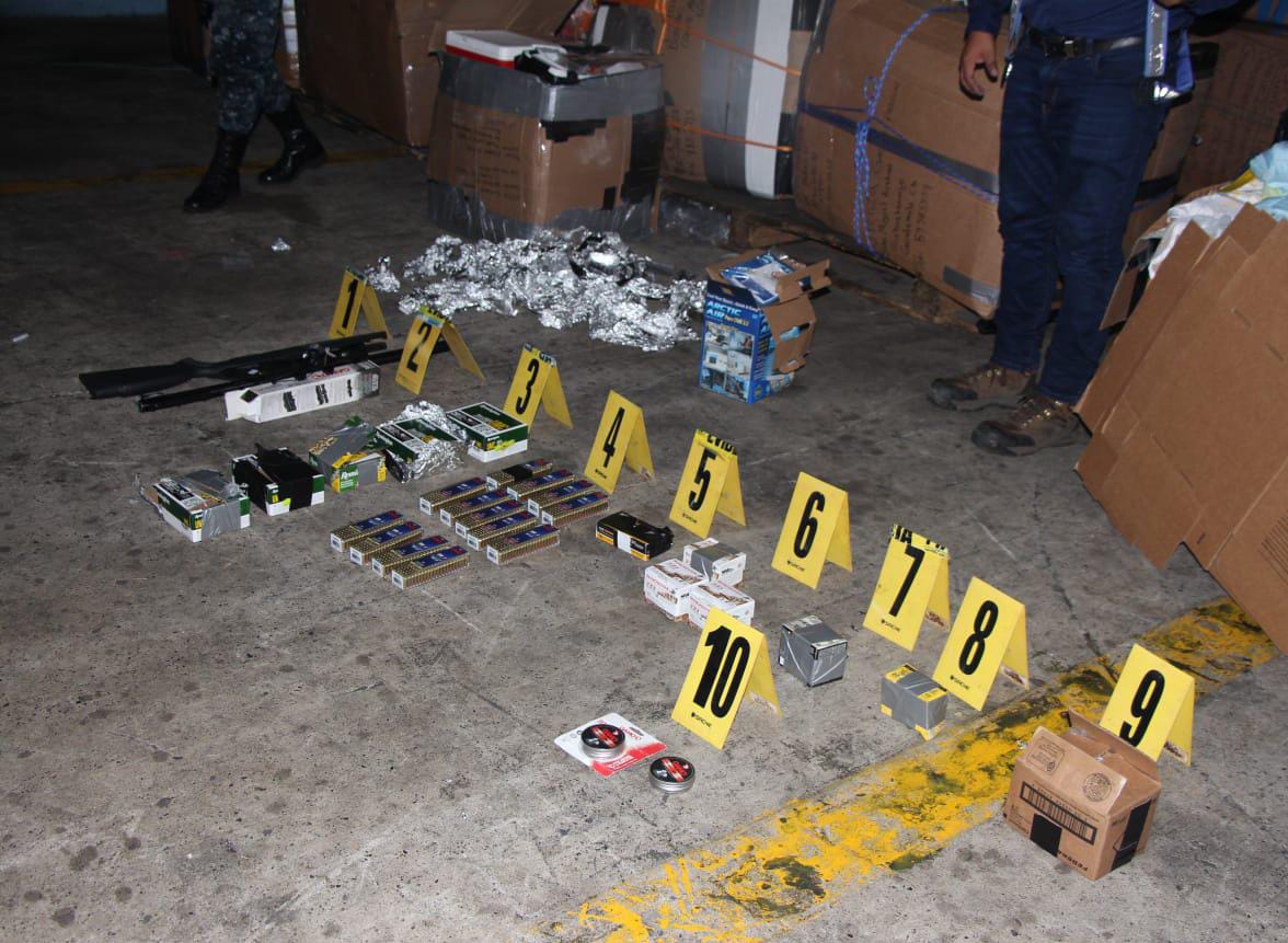 Elementos de la División Nacional de Puertos, Aeropuertos y Puestos Fronterizos (Dipafront) de la Policía Nacional Civil (PNC), reportan la localización de municiones y armamento, tras la inspección a la mercadería en contenedores de la Portuaria de Santo Tomás de Castilla, Puerto Barrios, Izabal.