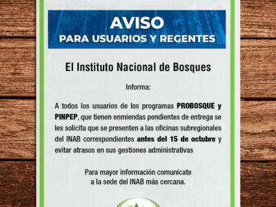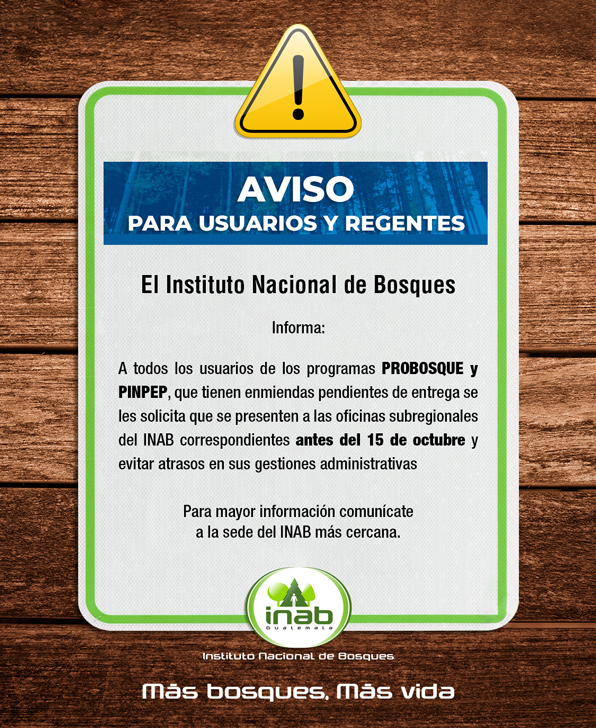 El INAB solicita a todos los usuarios de los programas de incentivos forestales que se aseguren de mantener activas sus cuentas bancarias en el Banco de Desarrollo Rural -BANRURAL- o el Crédito Hipotecario Nacional -CHN- para no tener inconvenientes al momento de acreditar los pagos correspondientes.