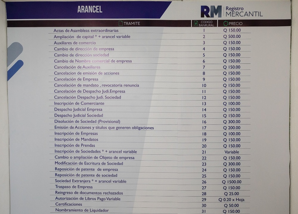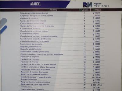 (1) LIstado de servicios que se prestan en la Sede Auxiliar del Registro Mercantil, ubicada en Edificio Galerías Reforma, Zona 9.