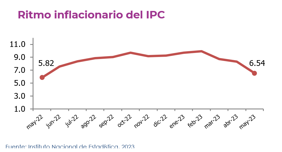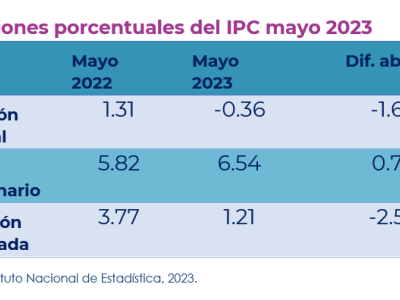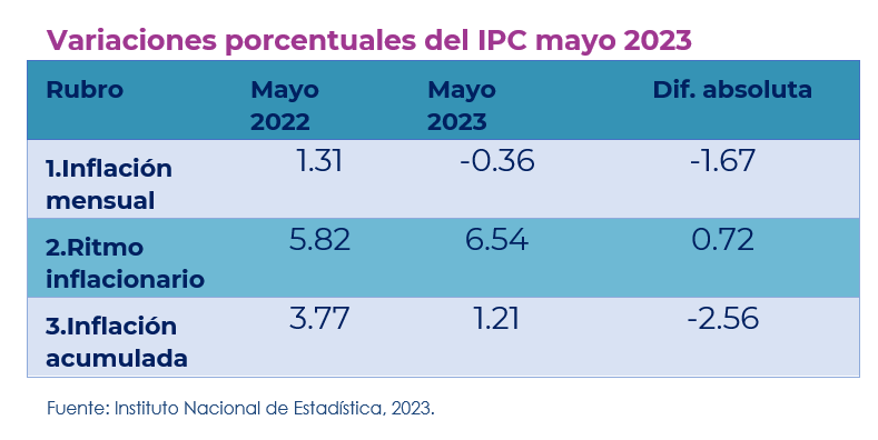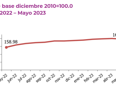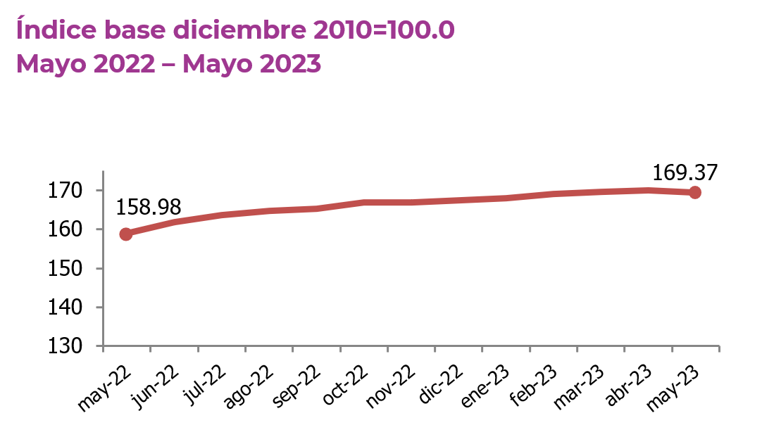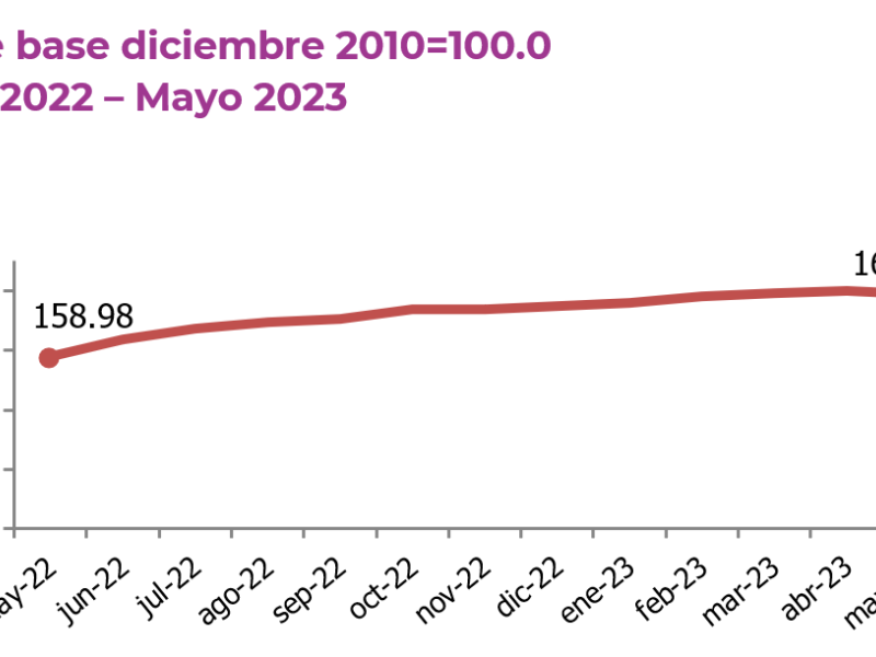 Guatemala, 07 de junio de 2023. Durante mayo, el IPC se ubicó en 169.37, registrando una inflación mensual de -0.36%, con un ritmo inflacionario de 6.54% y una inflación acumulada de 1.21%.