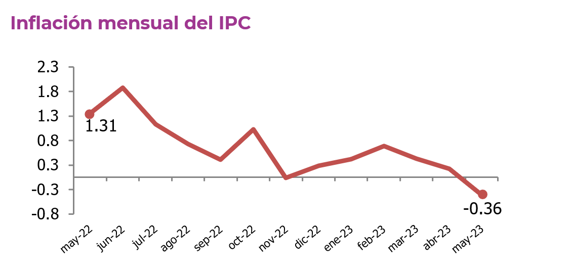 La principal división que incide en esta variación es transporte, dentro de los principales gastos básicos que registran la mayor incidencia negativa (importancia relativa dentro de los 279 gastos básicos), al mes de mayo de 2023 se encuentran: tomate (-0.16%), Servicio de viajes todo incluido dentro del país (-0.08%), servicio de transporte aéreo (-0.08%). Las principales incidencias positivas se presentan en: productos de tortillería (0.03%), almuerzos consumidor fuera del hogar (0.02%), aguacate (0.02%).