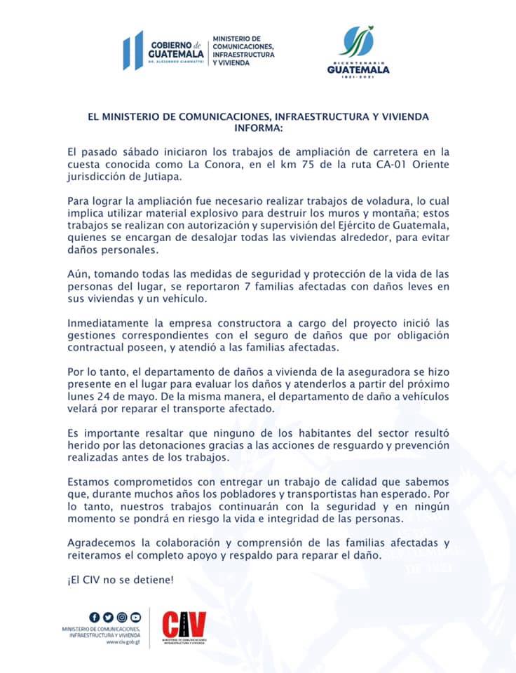 El Ministerio de Comunicaciones, Infraestructura y Vivienda, CIV, informa: