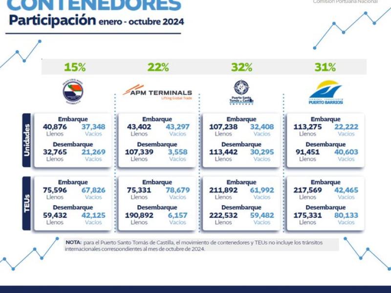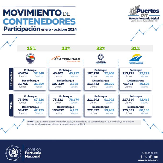Puerto Santo Tomás de Castilla: Con una participación del 55% en carga, este puerto ha sido clave en la exportación de frutas y vegetales, permitiendo que más agricultores guatemaltecos accedan a mercados internacionales con productos frescos y competitivos.