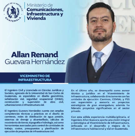 Con esta sólida experiencia multidisciplinaria, el Ingeniero Allan Guevara aporta una visión integral y estratégica al Viceministerio de Infraestructura, enfocada en el desarrollo y mejora de la infraestructura habitacional y vial en Guatemala.
