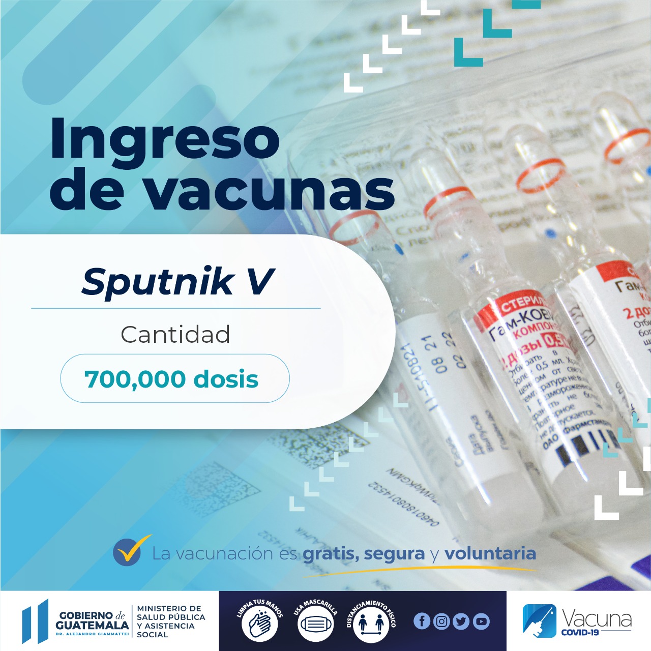 El Ministerio de Salud Pública y Asistencia Social -MSPAS- recibió 700 mil dosis de vacuna Sputnik V del segundo componente las cuales serán repartidas en las Áreas de Salud para intensificar el Plan Nacional de Vacunación contra el COVID-19.