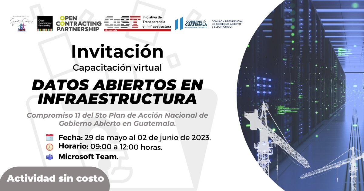 Guatemala, 29 de mayo de 2023. A partir de este lunes se llevarán a cabo 5 módulos públicos, como parte de la Capacitación de Datos Abiertos en Infraestructura, bajo el liderazgo de la Comisión Presidencial de Gobierno Abierto y Electrónico, Cost Guatemala, Fundación Prosperity Guatecivica.