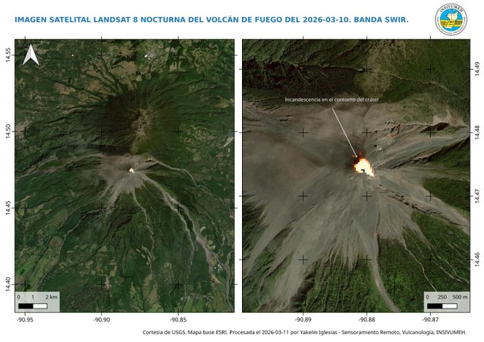 El Instituto Nacional de Sismología, Vulcanología, Meteorología e Hidrología (INSIVUMEH) compartió una imagen satelital nocturna del volcán de Fuego, correspondiente al 10 de marzo de 2026, obtenida a través del satélite Landsat 8.