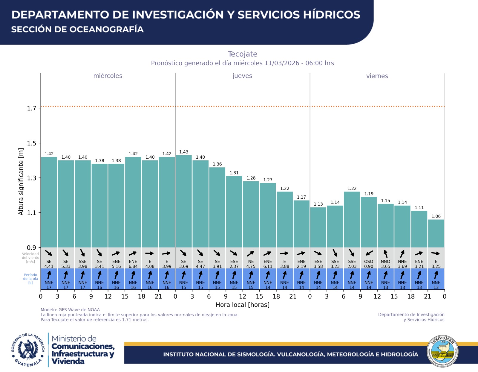 El Instituto Nacional de Sismología, Vulcanología, Meteorología e Hidrología (INSIVUMEH) dio a conocer el pronóstico de oleaje para las diferentes playas y costas de Guatemala, correspondiente al 11 de marzo de 2026, como parte del monitoreo permanente de las condiciones marítimas del país.