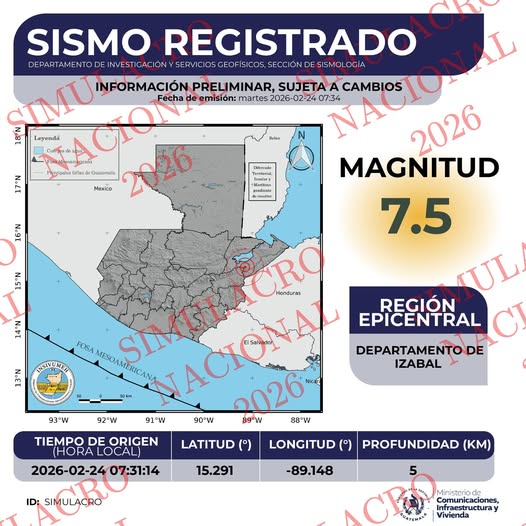 El Instituto Nacional de Sismología, Vulcanología, Meteorología e Hidrología (INSIVUMEH) informó los escenarios sísmicos durante el simulacro 2026, con el objetivo de fortalecer la preparación y respuesta ante posibles emergencias.