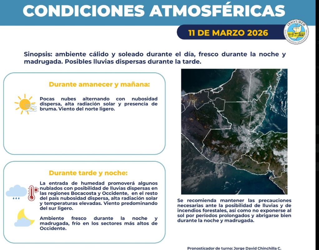 El Instituto Nacional de Sismología, Vulcanología, Meteorología e Hidrología (INSIVUMEH) dio a conocer el pronóstico de condiciones atmosféricas para este 11 de marzo de 2026, indicando que se espera ambiente cálido y soleado durante el día, con temperaturas más frescas durante la noche y madrugada.