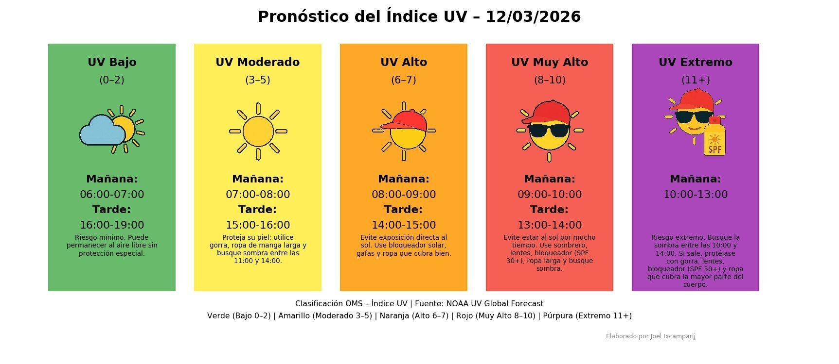 El Instituto Nacional de Sismología, Vulcanología, Meteorología e Hidrología (INSIVUMEH) invita a la población a consultar el Índice de Radiación Ultravioleta (UV) para Guatemala correspondiente al 12 de marzo de 2026, con el objetivo de conocer los horarios de mayor intensidad de radiación solar y adoptar las medidas necesarias para proteger la salud.