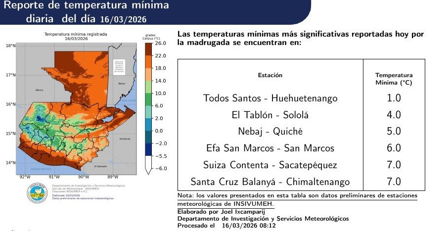 El Instituto Nacional de Sismología, Vulcanología, Meteorología e Hidrología (INSIVUMEH) dio a conocer el reporte de temperatura mínima diaria correspondiente al 16 de marzo de 2026, elaborado con base en los registros obtenidos por la red de estaciones meteorológicas distribuidas en el territorio nacional.