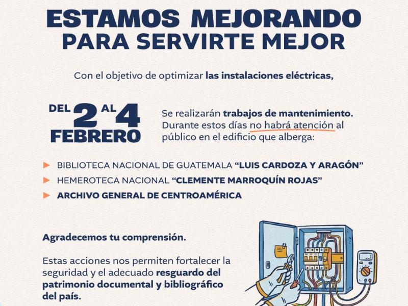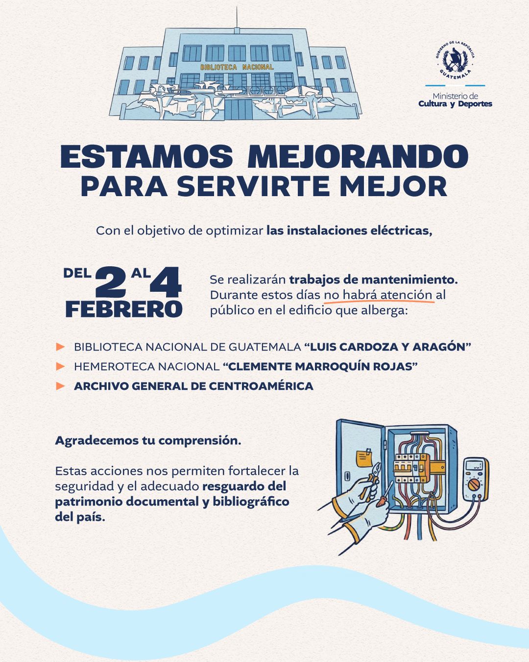 El Ministerio de Cultura y Deportes (MCD) informa a la población que del 2 al 4 de febrero la Biblioteca Nacional de Guatemala “Luis Cardoza y Aragón”, la Hemeroteca Nacional “Clemente Marroquín Rojas” y el Archivo General de Centroamérica permanecerán cerrados debido a trabajos de mantenimiento eléctrico.