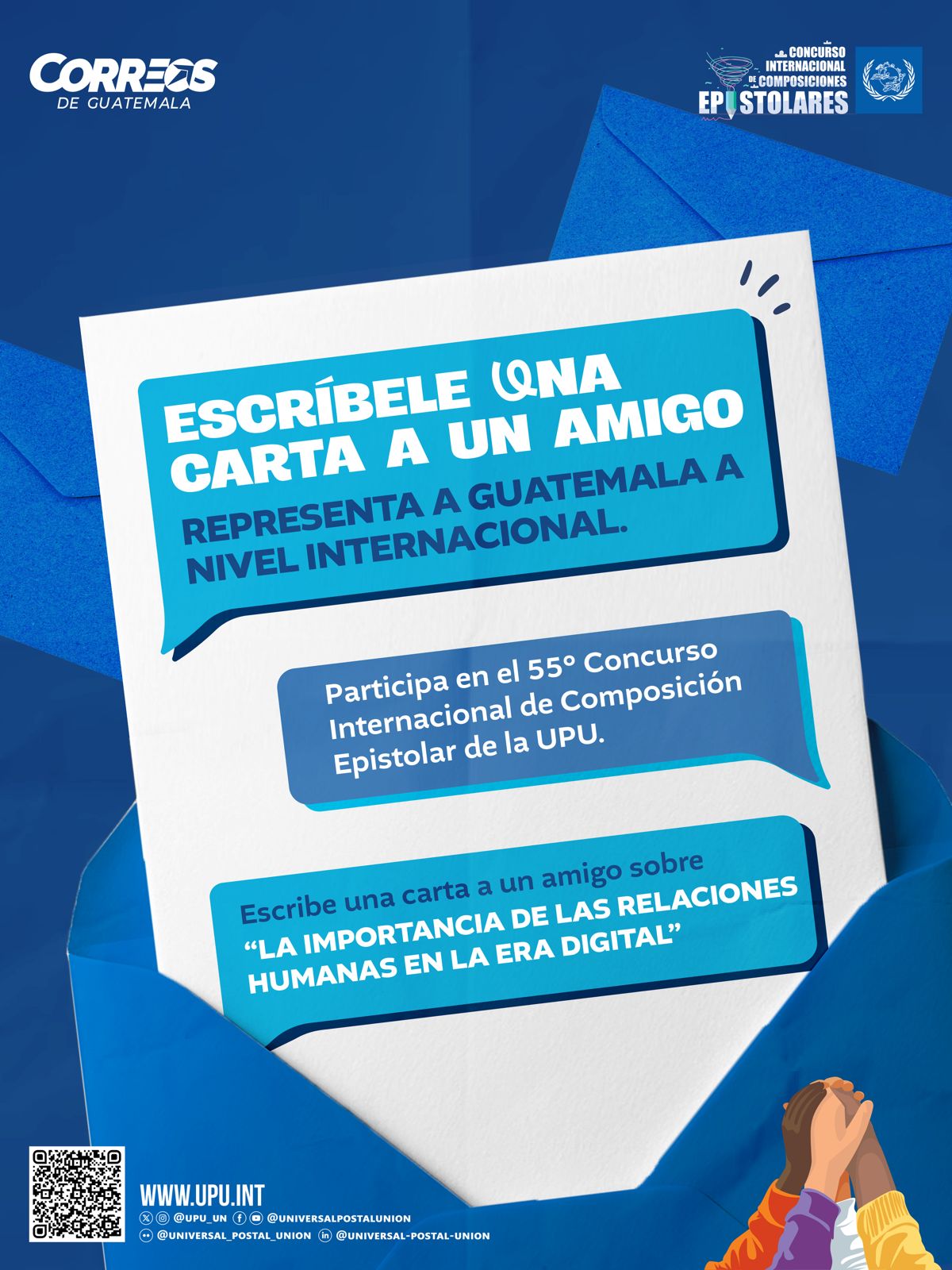 Correos de Guatemala, como miembro del Consejo de Explotación Postal de la Unión Postal Universal, invita a la niñez y juventud del país a participar, aprovechando esta oportunidad para expresar sus ideas y representar con orgullo a Guatemala en el ámbito internacional.