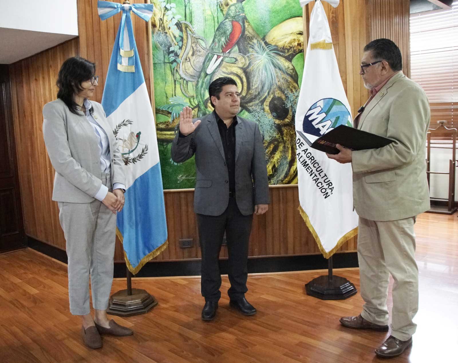 El ingeniero Mario Cano fue juramentado como director de la Dirección de Coordinación Regional y Extensión Rural (DICORER) por el ministro de Agricultura, Ganadería y Alimentación (MAGA), Mynor Estrada, acompañado de Klemen Gamboa, viceministra de Seguridad Alimentaria y Nutricional.