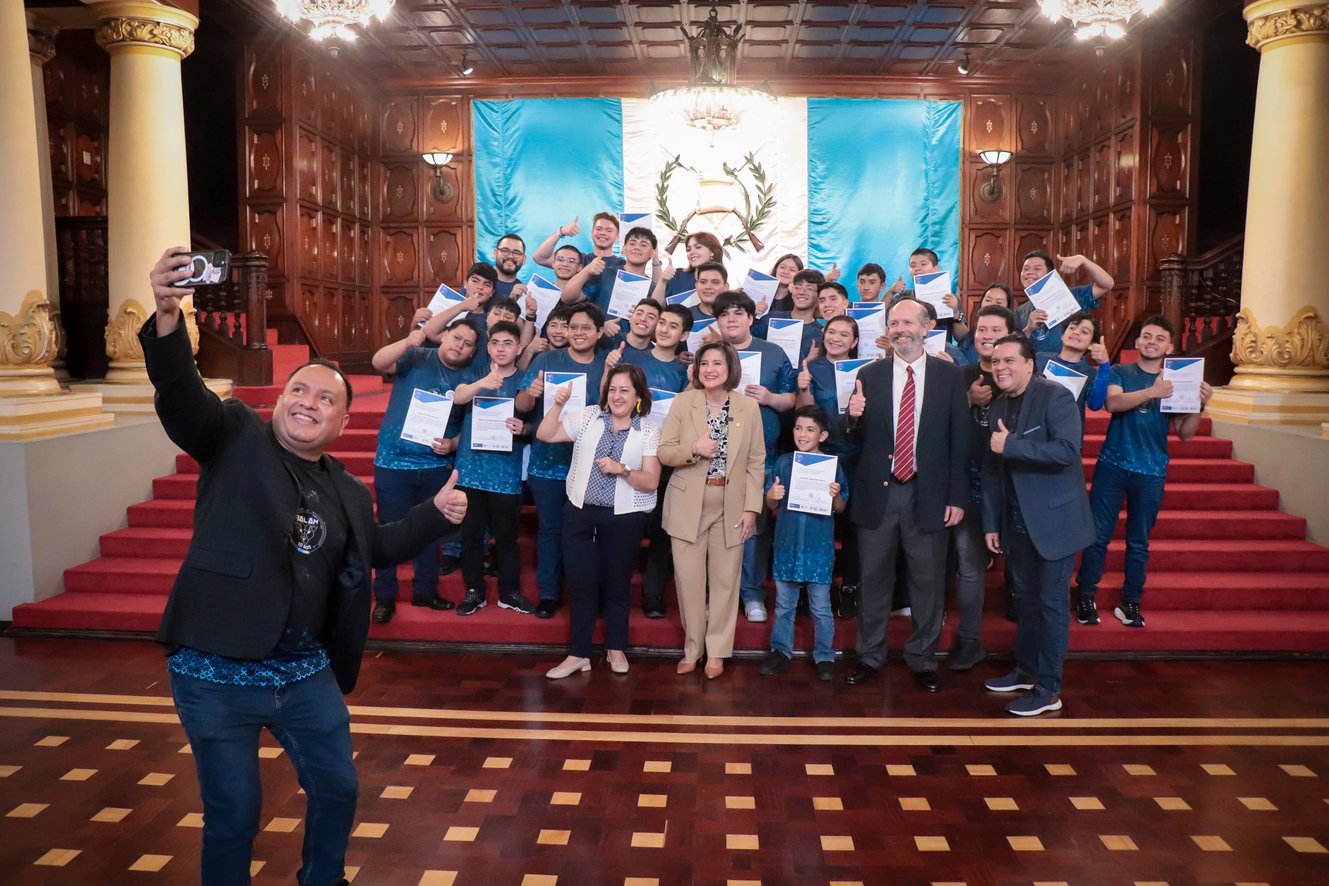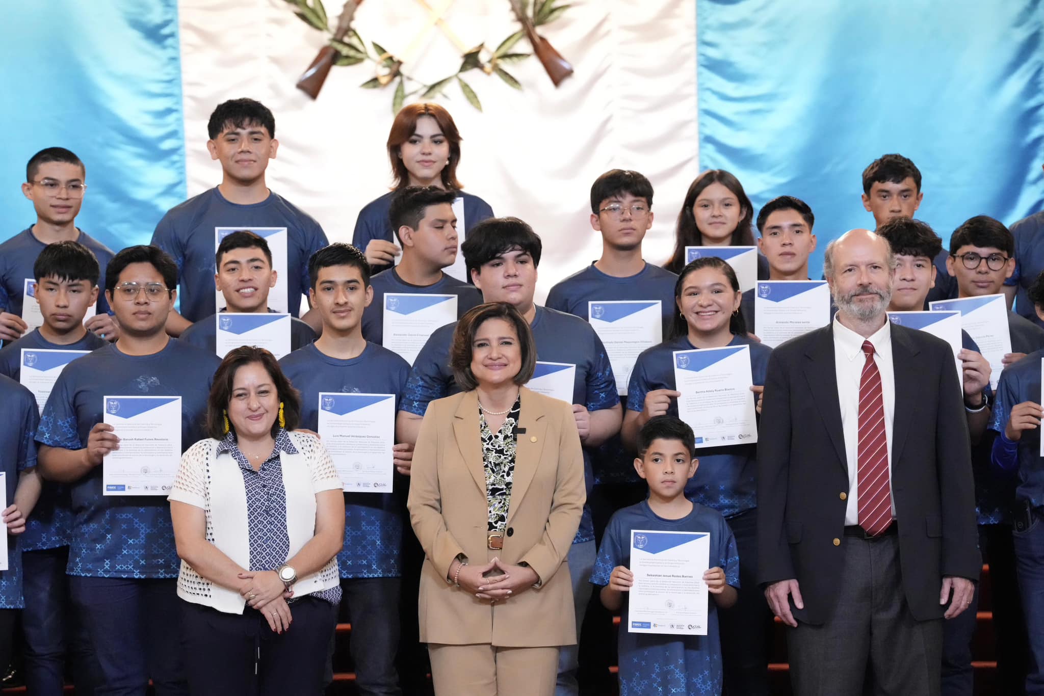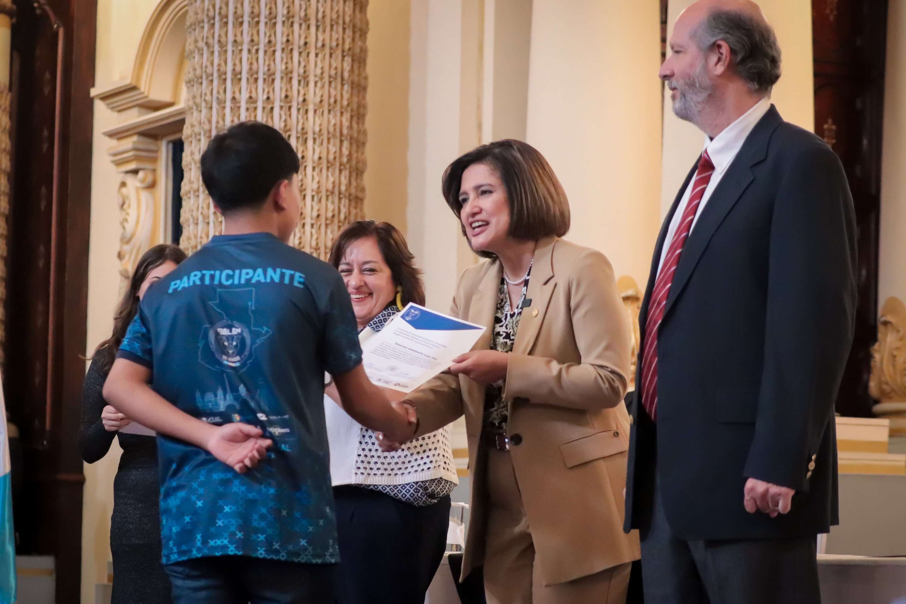 Karin Herrera, vicepresidenta de la República, dijo a los jóvenes “gracias por asumir este noble compromiso. Al elevar el nombre de Guatemala en cada desafío, no solo representan a nuestra nación, sino también a la niñez y juventud con entusiasmo y esperanza”.