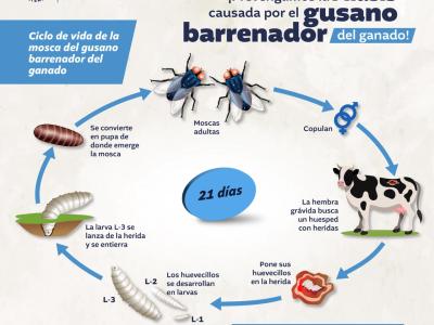La mosca del gusano barrenador del ganado tienen un ciclo de vida de 21 días, esta sirve de transporte para las larvas. Una de las estrategias claves que el MAGA impulsa son las parrillas aéreas, con estas se dispersan moscas estériles para reducir la población de estos parásitos.