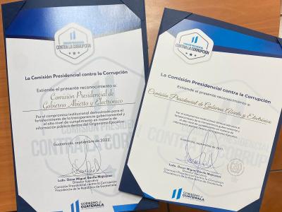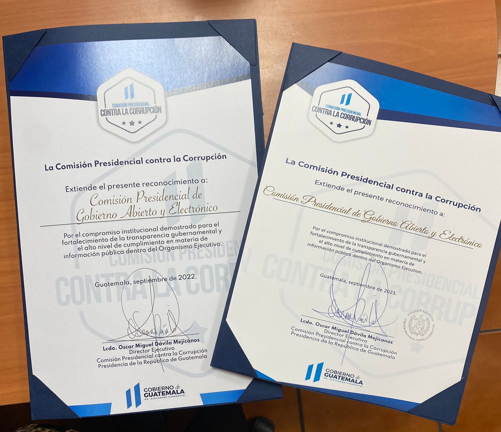 Guatemala, 26 de septiembre 2023. La Comisión Presidencial de Gobierno Abierto y Electrónico (GAE) ha sido reconocida por segundo año consecutivo por la Comisión Presidencial Contra la Corrupción (CPCC) por su compromiso con la Ley de Acceso a la Información Pública. Este reconocimiento se otorgó tras la supervisión de los Portales Web realizada por la Secretaría de Acceso a la Información del Procurador de Derechos Humanos.