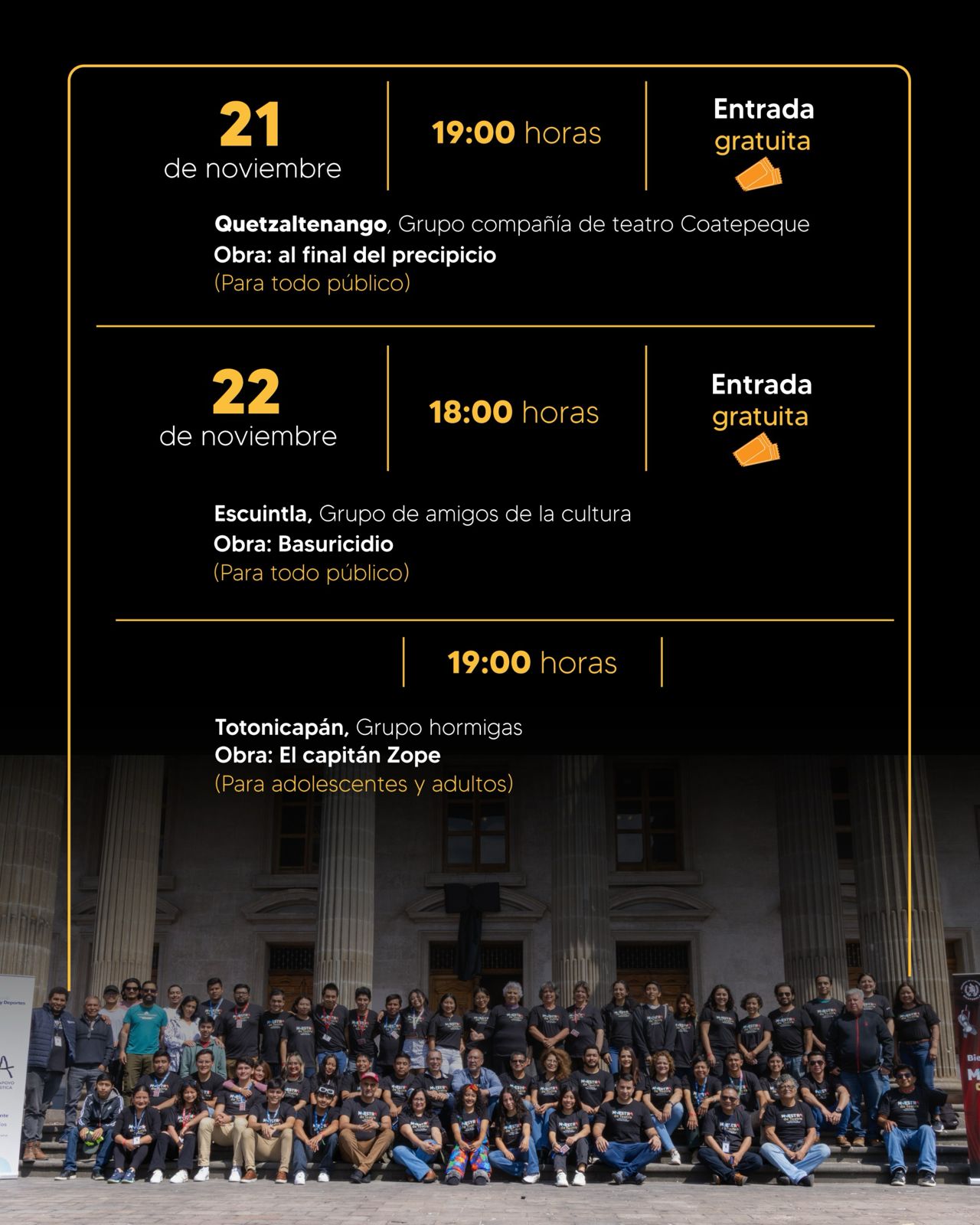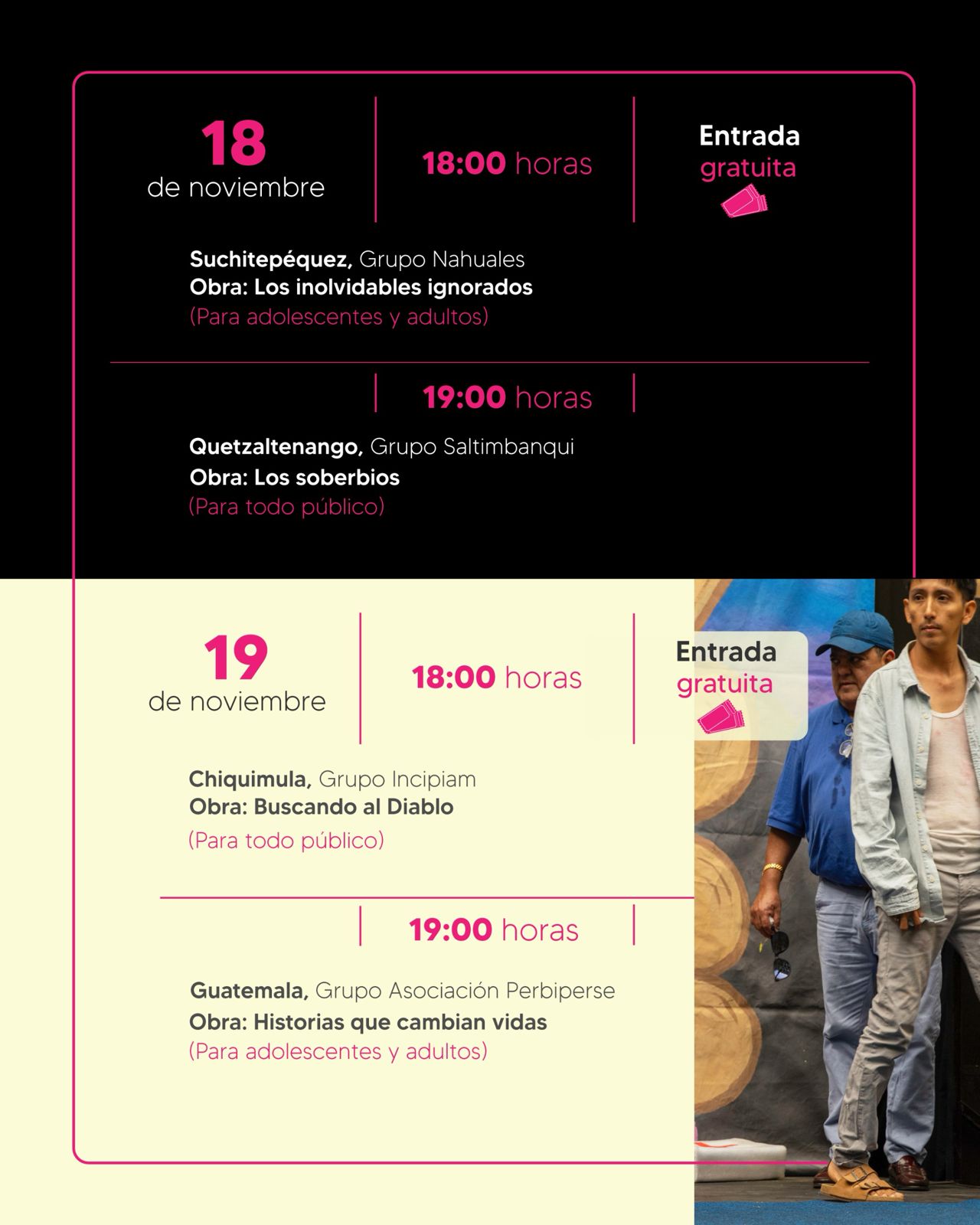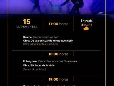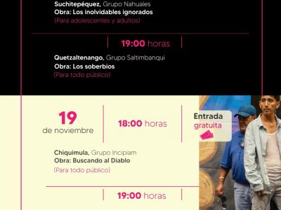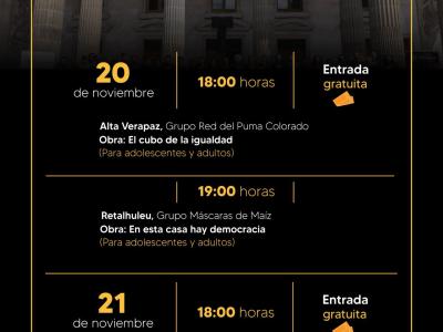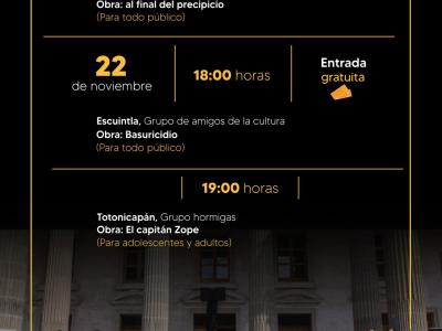 Del 14 al 22 de noviembre 19 grupos teatrales de distintos departamentos de la República se presentarán en el escenario del Centro Cultural de Escuintla y tú puedes ser testigo de este derroche de talento.