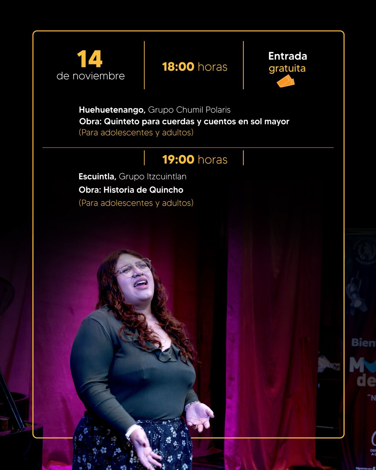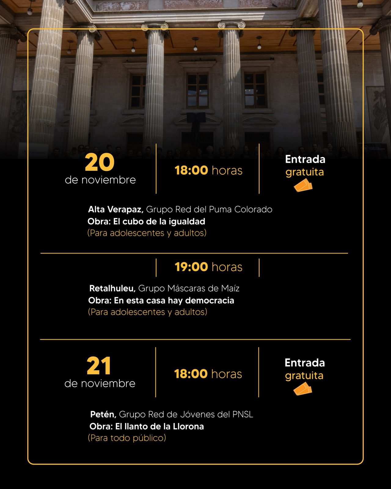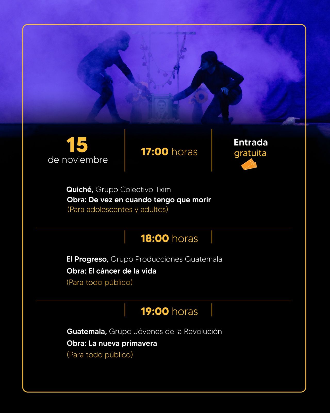 Del 14 al 22 de noviembre 19 grupos teatrales de distintos departamentos de la República se presentarán en el escenario del Centro Cultural de Escuintla y tú puedes ser testigo de este derroche de talento.