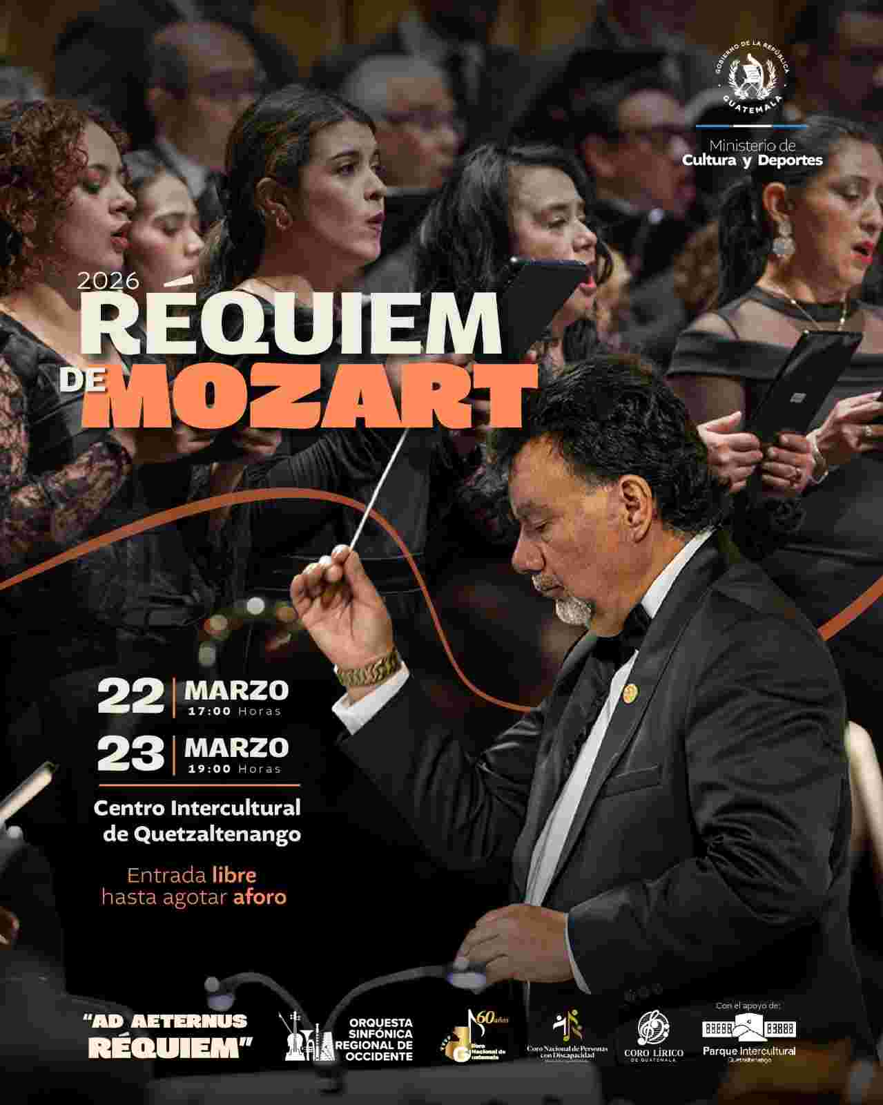 La Orquesta Sinfónica Regional de Occidente llega mañana al Centro Intercultural junto al Coro Ad Aeternus, conformado por el Coro Nacional de Guatemala, el Coro Nacional de Personas con Discapacidad, el Coro Lírico de Guatemala y el Coro Externo, de artistas que audicionaron para la Temporada Coral Sinfónica, para interpretar el Réquiem de Mozart bajo la dirección del maestro Marvin Ardany López.