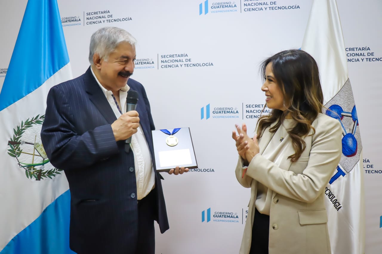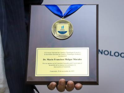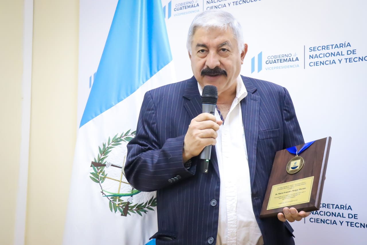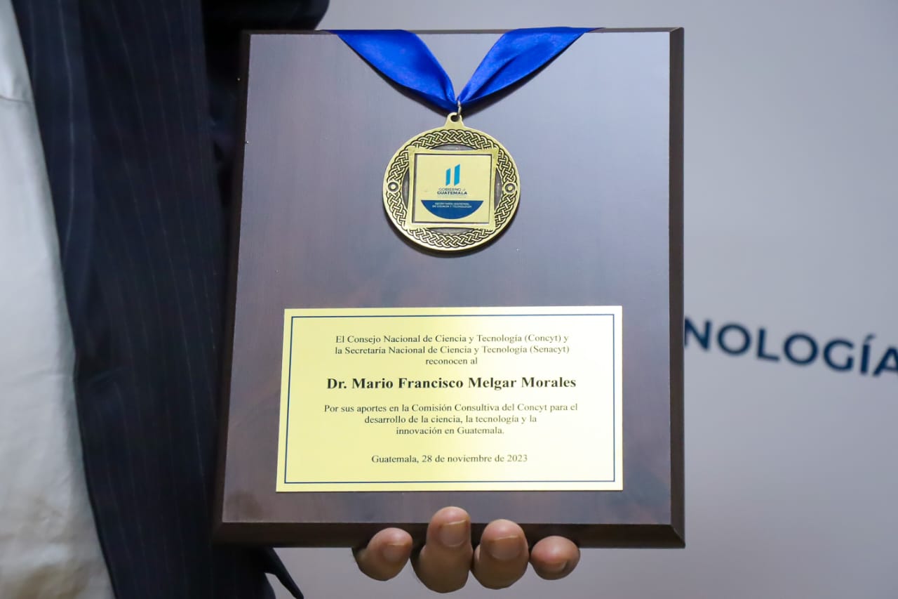 Por sus valiosos aportes en favor del desarrollo científico, principalmente en el sector agroindustrial y su participación en la Comisión Consultiva del Consejo Nacional de Ciencia y Tecnología (Concyt), el Doctor Mario Melgar recibió un reconocimiento el cual fue entregado por la secretaria Nacional de Ciencia y Tecnología, Ana Chan.
