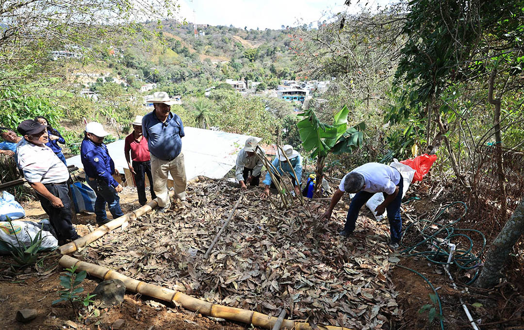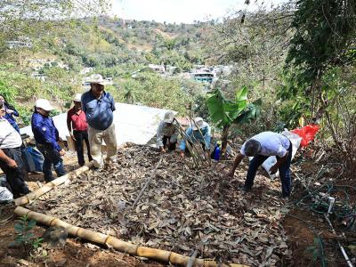 El terreno se rompe el suelo utilizando la técnica de curvas a nivel, para nivelarlo y acto seguido se incorpora la hojarasca o materia orgánica, la cual se deja reposar por al menos 24 horas. Luego de ello se vuelve labrar la tierra, agregando más tierra mineral y agua, para mantener húmeda el área y así iniciar la descomposición de la materia orgánica.