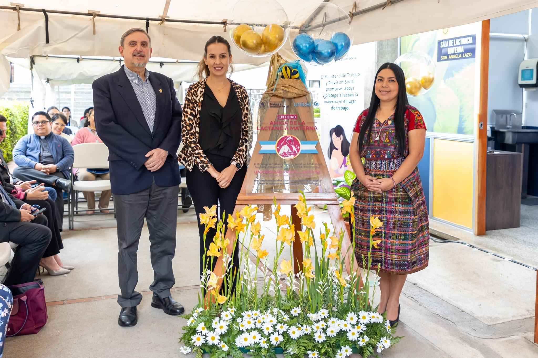 El Ministerio de Trabajo y Previsión Social (MINTRAB), a través de su Sección de Mujer Trabajadora y con el apoyo del Fondo de las Naciones Unidas para la Infancia (UNICEF), reconoció a la Universidad Rafael Landívar por la implementación de un “Espacio Amigo de la Lactancia Materna”. Este logro fue acompañado por la viceministra de Previsión Social y Empleo, Claudia Peneleu, quien destacó que la iniciativa representa un avance en los derechos laborales de las madres trabajadoras y contribuye al bienestar de la niñez y de las familias guatemaltecas.