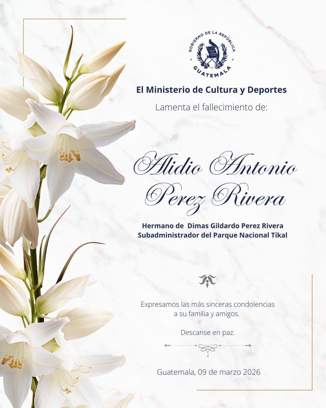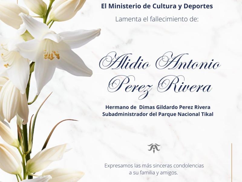 Lamentamos profundamente el sensible fallecimiento de Alidio Antonio Perez Rivera, hermano de Dimas Gildardo Perez Rivera Subadministrador del Parque Nacional Tikal.