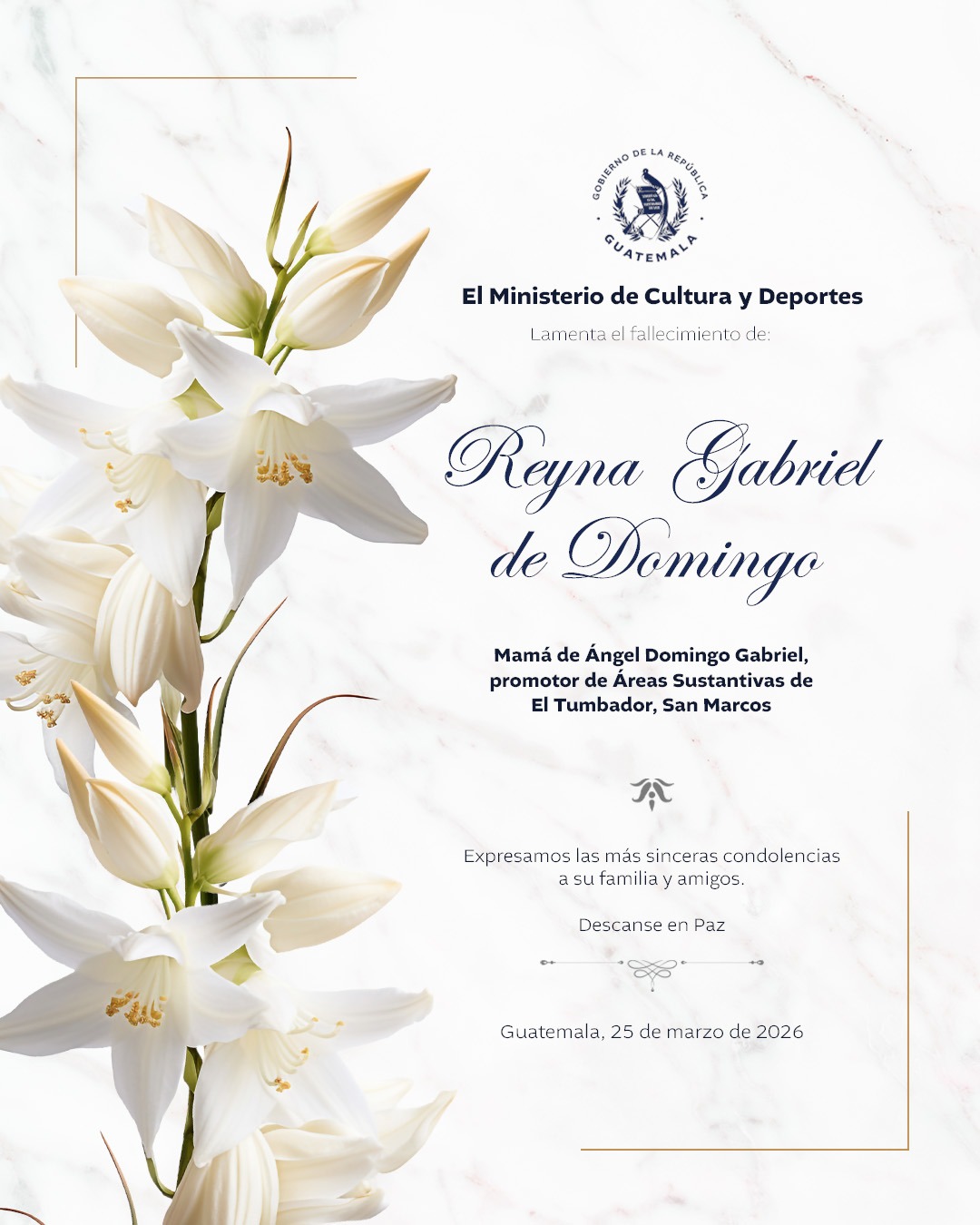 Lamentamos profundamente el sensible fallecimiento de Reyna Gabriel de Domingo, madre de Ángel Domingo Gabriel, promotor de Áreas Sustantivas de El Tumbador, San Marcos.