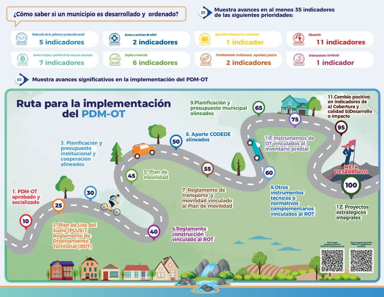 El PDM-OT es el instrumento de largo plazo en el cual se planifican las acciones para atender a las necesidades específicas en cada municipio y articuladas a las Prioridades Nacionales de Desarrollo en el territorio que incluye áreas de salud, educación, seguridad alimentaria, acceso al agua y gestión de los recursos naturales, entre otros, valiéndose también para ello en generar las condiciones que permitan desarrollar las potencialidades de cada territorio.