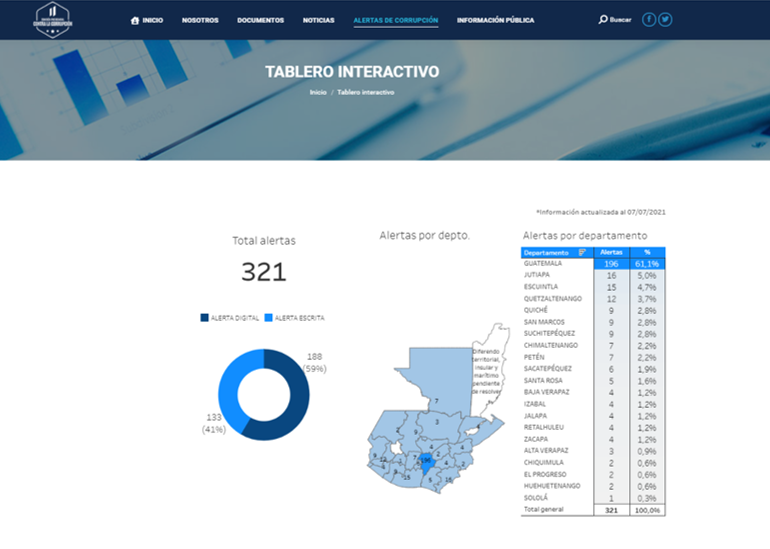 Se trata de un tablero digital interactivo, disponible en la página www.cpcc.gob.gt (en la sección Alertas de corrupción), que contiene el total de alertas recibidas, tanto electrónicas como escritas, para consultar estadísticas por campos: fecha, departamento y región.