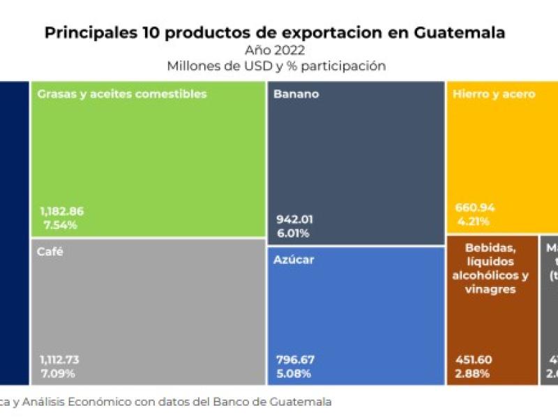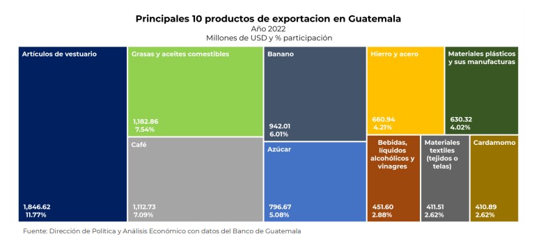 De acuerdo con el más reciente informe de la Dirección de Política y Análisis Económico del viceministerio de Integración y Comercio Exterior, dentro del mapa de los principales cinco productos de exportación de Guatemala figuran en primer lugar los artículos de vestuario con US$1,846.62 millones (11.77%), seguidos de las grasas y aceites comerciales con US$1,182 (7.54%), el café con US$1,112.73 millones (7.09%), banano con US$942.01 millones y azúcar con US$796.67 millones (5.08%).