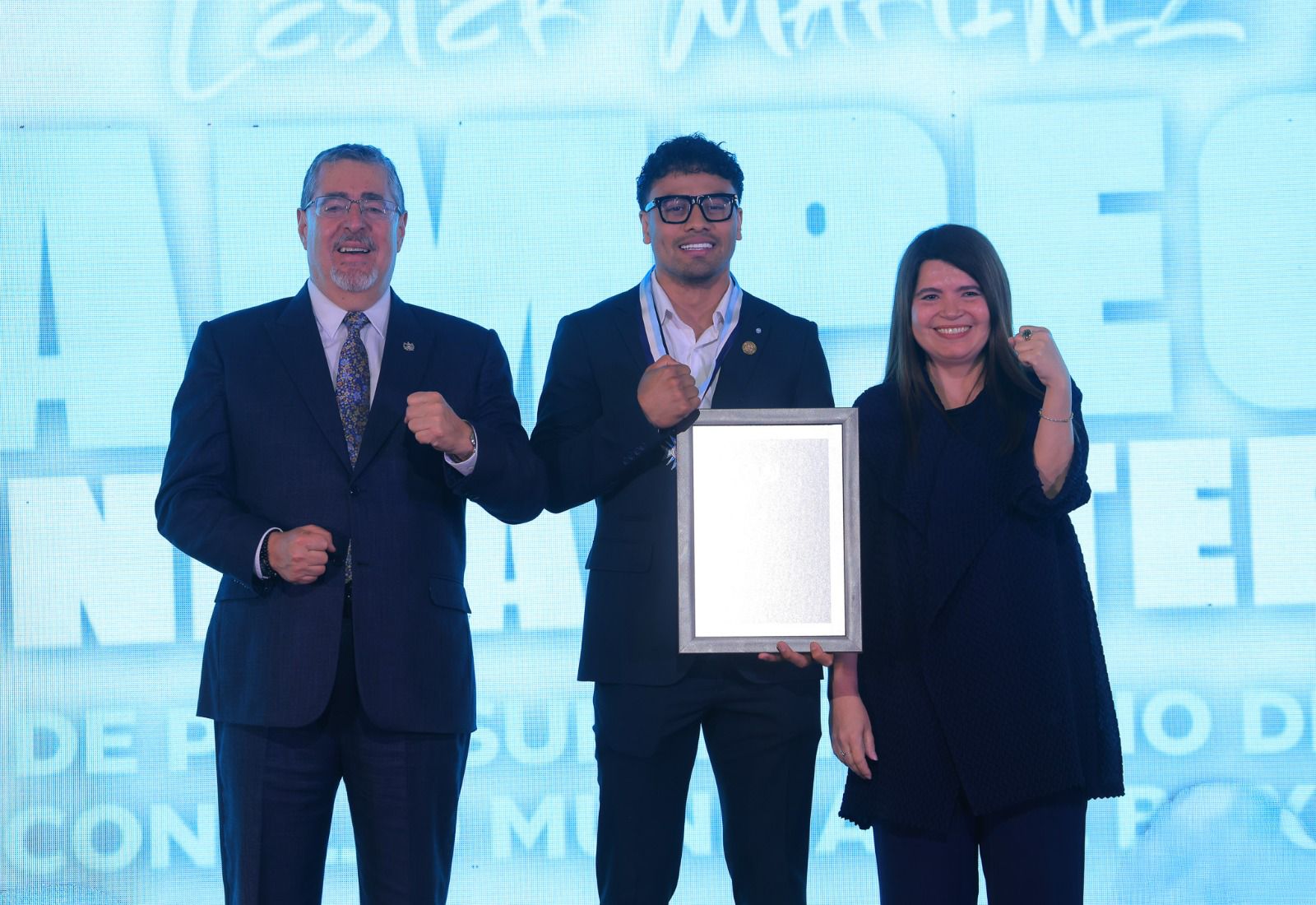 El acto, llevado a cabo en el Patio de la Paz del Palacio Nacional de la Cultura, fue encabezado por el presidente Bernardo Arévalo, quien hizo entrega del reconocimiento como muestra del valor que representan los logros deportivos para el país. El mandatario estuvo acompañado por la vicepresidenta de la República, Karin Herrera, y por su gabinete de Gobierno.