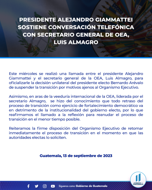 Este miércoles se realizó una llamada entre el presidente Alejandro Giammattei y el secretario general de la OEA, Luis Almagro, para oficializarle la decisión unilateral del presidente electo Bernardo Arévalo de suspender la transición por motivos ajenos al Organismo Ejecutivo.