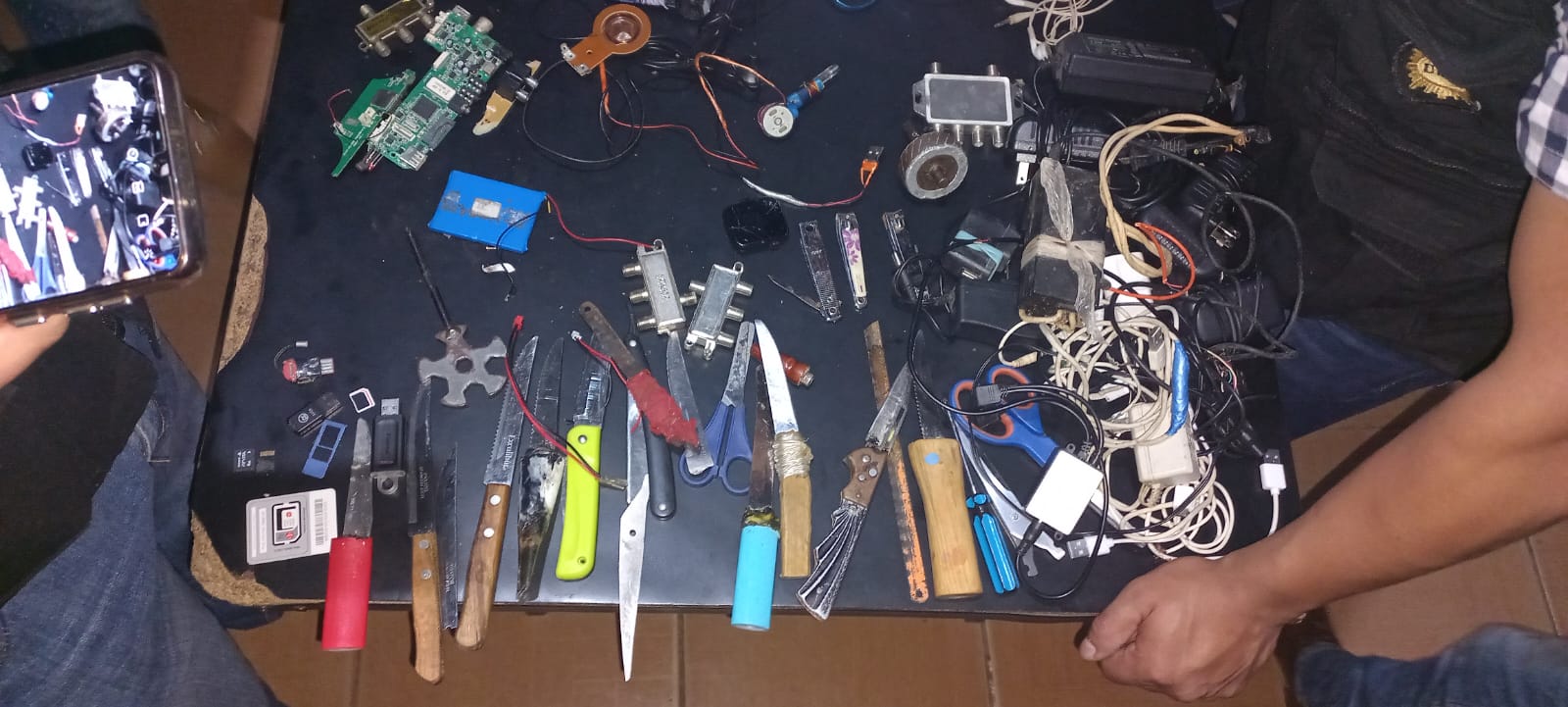 Los efectivos policiales mediante la inspección en el centro carcelario, localizaron 28 cargadores para dispositivos móviles, 20 cuchillos, 26 adaptadores para carga de aparatos eléctricos, 7 antenas para recepción de señal telefónica, 2 memorias USB, 2 adaptadores micro USD, 2 memorias micro SD, una tarjeta SIM, una pistola de plástico y varios metros de cables.