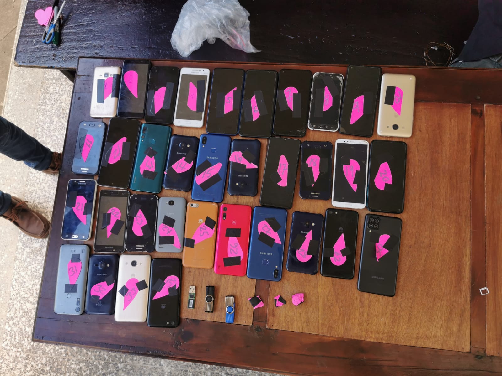 La inspección exhaustiva tuvo el apoyo de los agentes caninos K-9 de nombres Tusa y Thunder, se localizaron 34 dispositivos móviles, 3 memorias USB, cargadores para celular, 10 memorias micro SD y cables para señal de telefonía e internet.